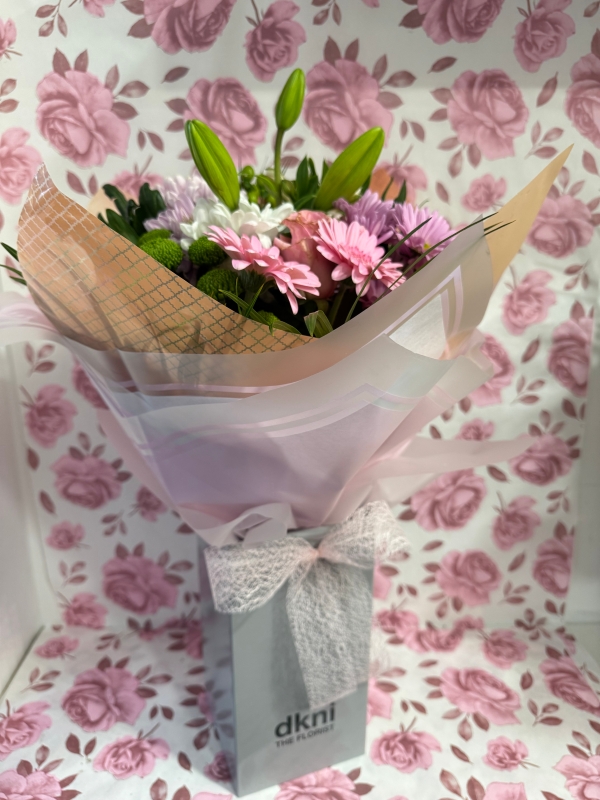 • Bells choice handtied bouquet gift wrapped in box with water